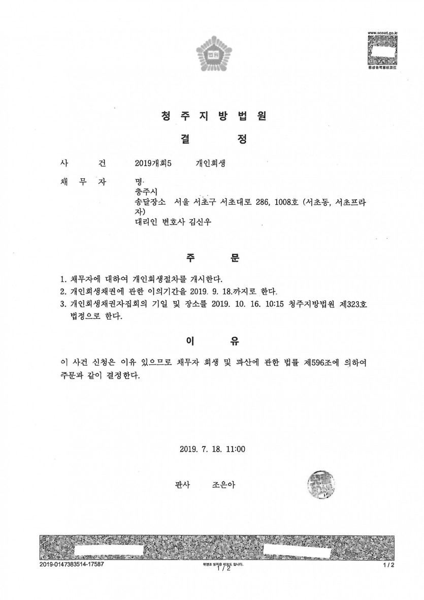 2. 접수 법원: 청주지방법원